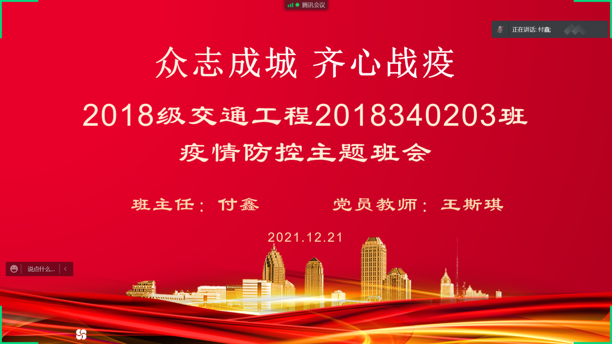 20211221日,结对帮扶工作任务下达的当晚,党员教师王斯琪便召集2018级交工3班的同学们,开展“众志成城、齐心战役”疫情防控线上主题班会。