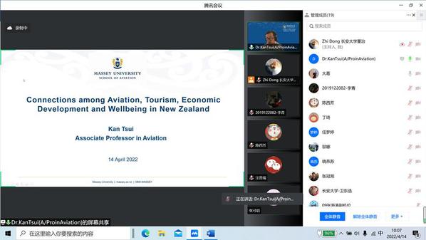 2022年4月14日上午10点,新西兰梅西大学航空学院Kan Tsui副教授应邀为新葡京线上娱乐 师生在线作了题为“Connection between aviation, economies and wellbeing: Evidence from New Zealand”的学术报告;院长葛颖恩教授主持了报告会。