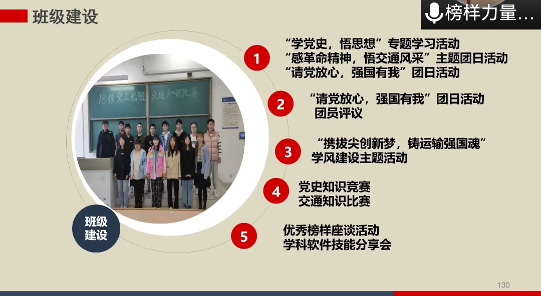 班级引领之星获得班级2018340201班团支书刘宇飞,在宣讲中表示班级建设至关重要,以“一人为大家,大家为一人”为班级的精神,以朴实、踏实、务实的作风为班级的行为准则,凝聚班魂,紧紧围绕树立坚定理想信念和建设优良班风学风的目标,能够团结全体同学,共同取得进步。