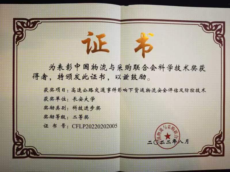 近日,中国物流与采购联合会发布了2022年度中国物流与采购联合会科技进步获奖项目的通知,新葡京线上娱乐 王建军教授、邓亚娟教授、龙雪琴副教授、梁国华教授、王来军教授、张玉婷讲师、陈亦新副教授、王宝杰副教授、马超群副教授共同承担完成的课题“高速公路交通事件影响下货运物流安全评估及防控技术”荣获2022年度中国物流与采购联合会科技进步奖二等奖。颁奖大会于2022年8月24日在哈尔滨举行。
