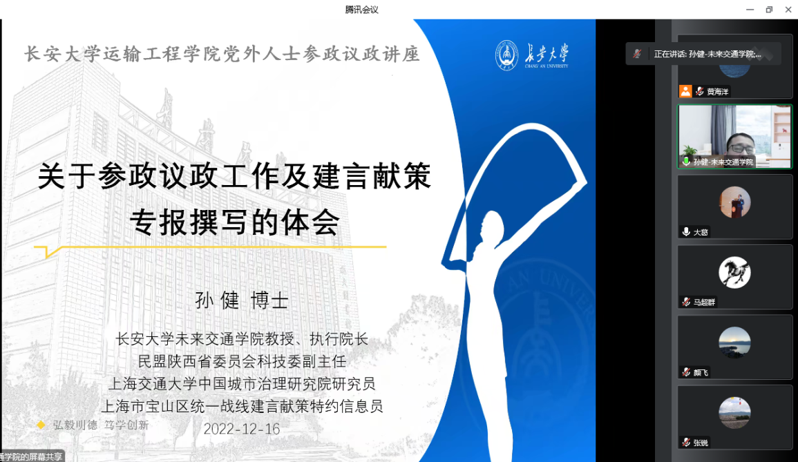 会议邀请到了长安大学未来交通学院孙健教授作《关于参政议政工作及建言献策专报撰写的体会》报告。孙健从参政议政概述和定位(以民盟为例),参政议政的主要形式即民主党派参政议政四类渠道,参政议政建言献策文稿撰写,案例简析四个方面,重点介绍了政策建议信、调研报告、参政议政建言献策专报的写作要求,同时围绕个人工作实际和交通运输专业优势,从选题、报送渠道等方面分享了撰写建言献策专报成功的案例和经验。