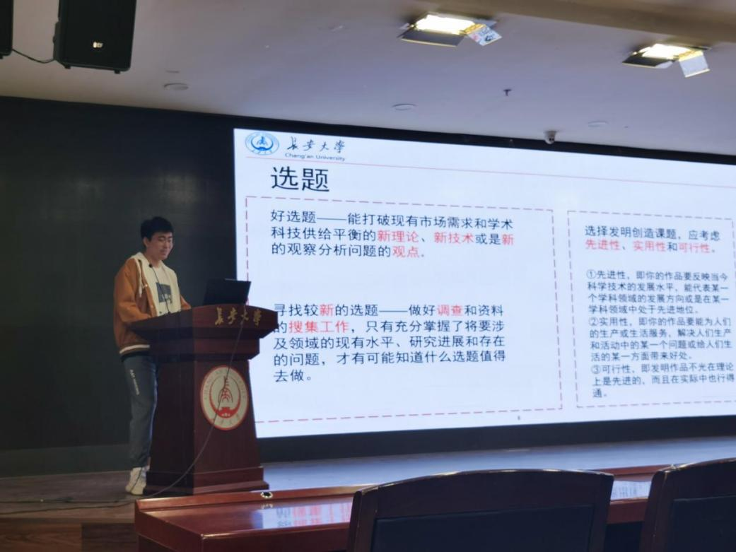 汽车学院郝时杰同学简单介绍了“挑战杯”全国大学生课外学术科技作品竞赛(大挑)和“挑战杯”中国大学生创业计划大赛(小挑)的区别,并在选题和材料准备方面分享了自己的经验。