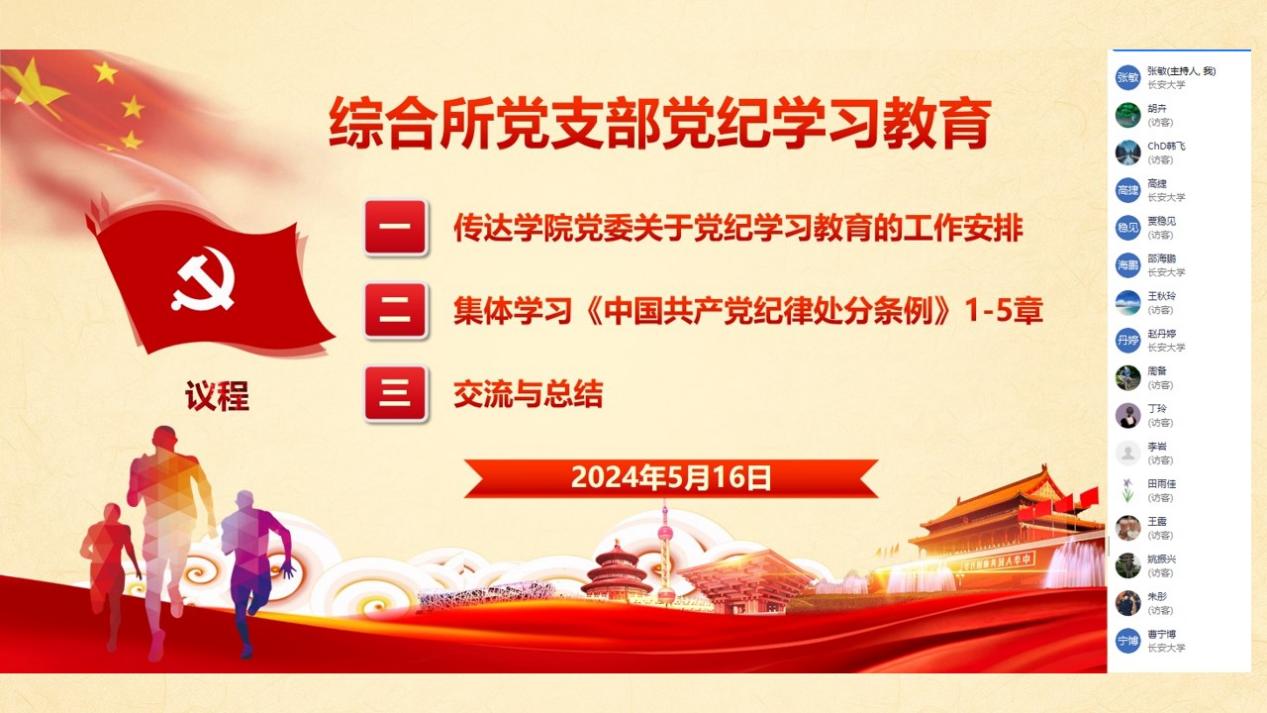 5月16日晚,综合所党支部召开支部党员扩大会议,开展党纪学习教育。综合所党支部全体党员及党外教师参加了会议,会议由支部书记张敏主持。