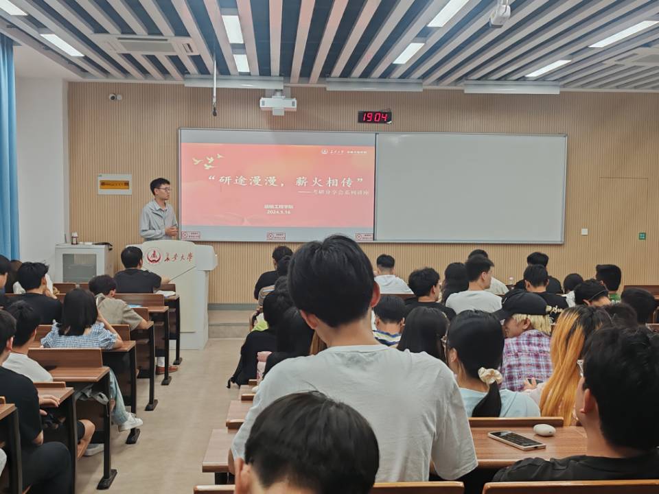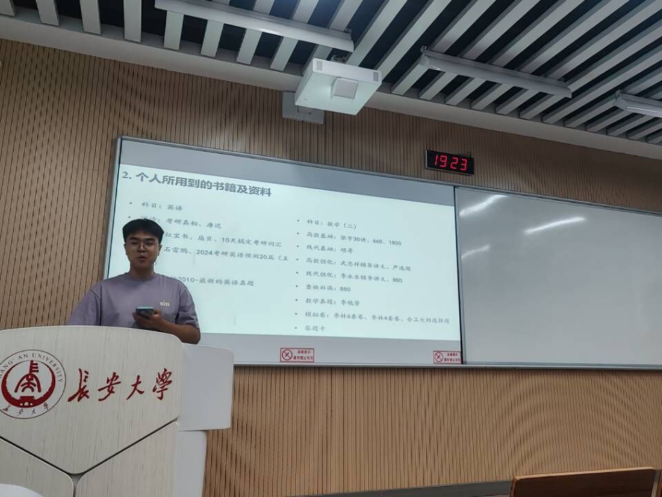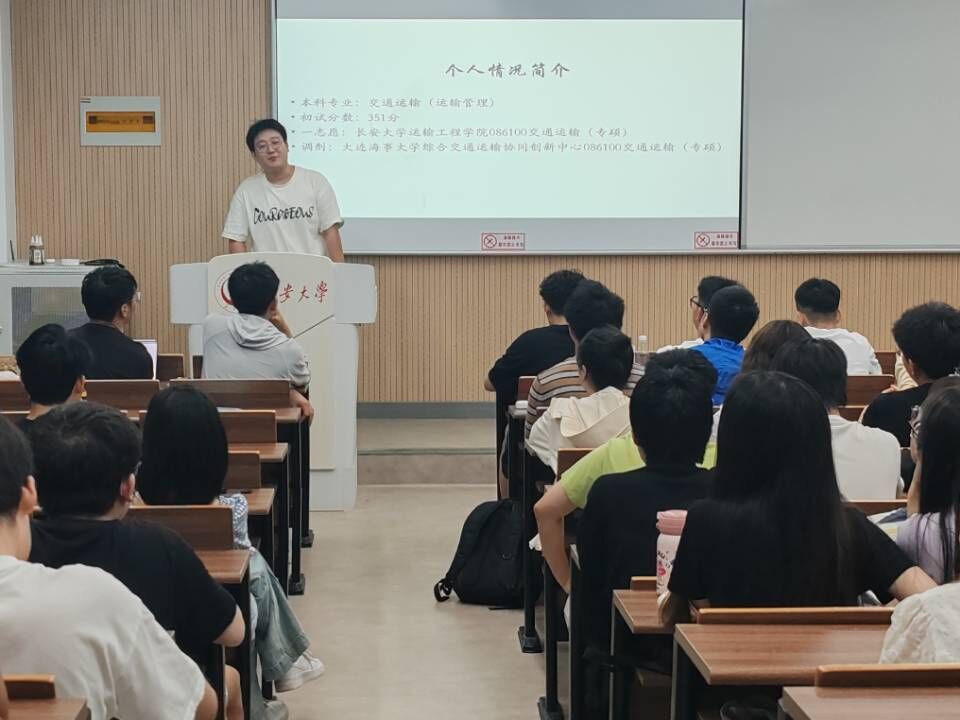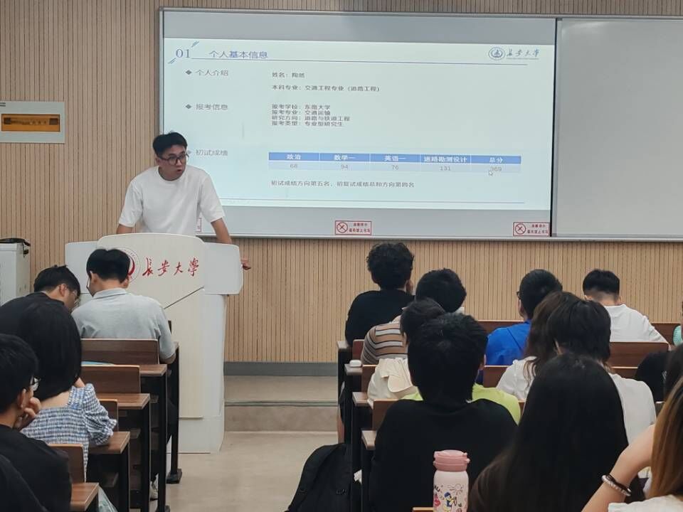 分享会邀请成功上岸长安大学、中南大学、北京交通大学、西南交通大学、大连海事大学和东南大学的优秀同学分享自己的考研经验和心得。分享内容围绕考研科目的学习策略以及心态调整等方面,为现场学生推荐复习资料以及学习软件。分享会最后,在场学生踊跃发言提问,分享者一一耐心解答问题。