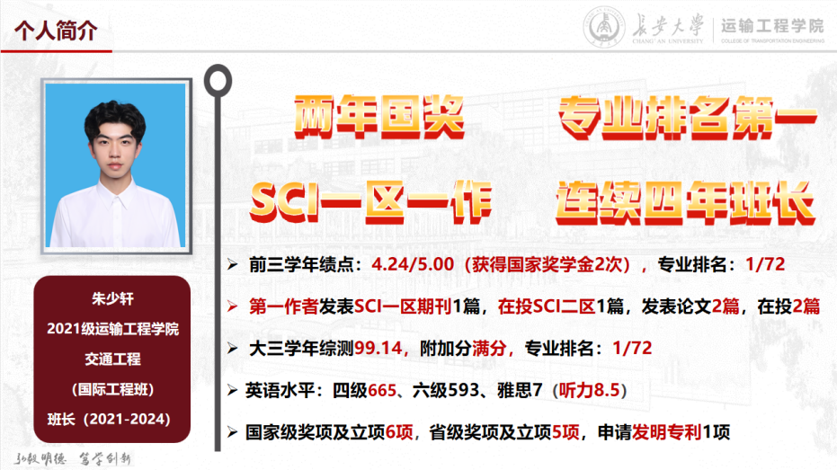 朱少轩,2021级交通工程(国际工程班)专业,担任四年班长,专业成绩排名1/72。四级665,六级593,雅思7.0。获得国家奖学金两次,发表SCI一区一作论文一篇,EI会议一篇,投稿北大核心一篇,SCI二区论文一篇。获得国家级奖项及立项六项,省级奖项及立项五项。获得长大标兵个人奖及双创之星奖。