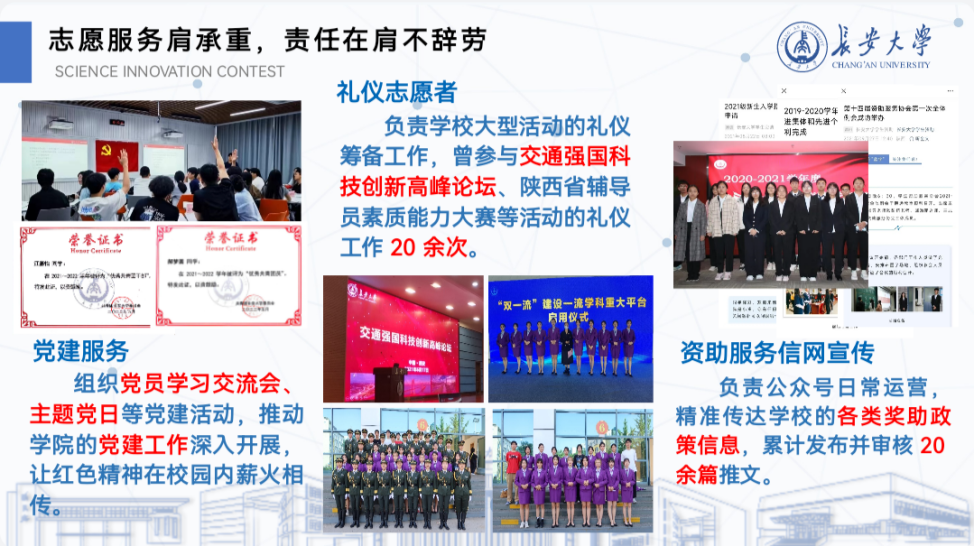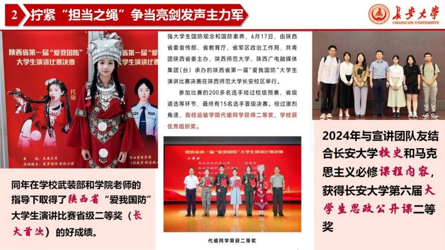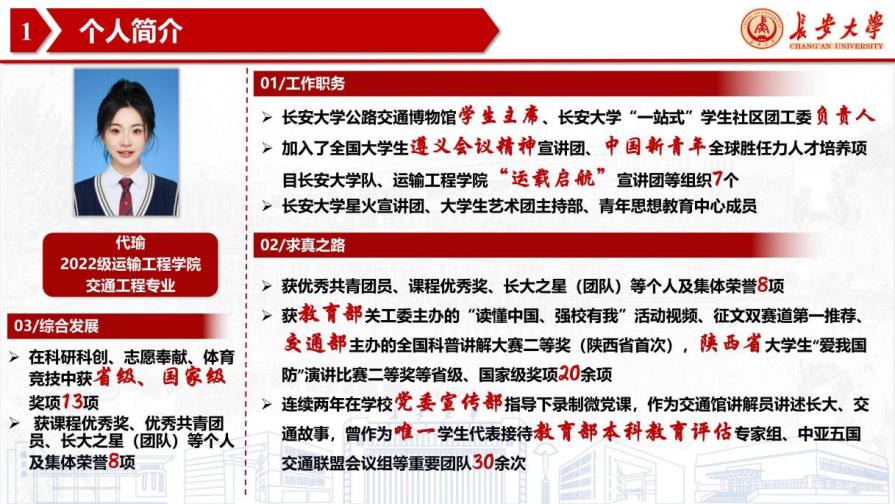 代瑜,女,汉族,新葡京线上娱乐 2022级交通工程专业学生。连续两年综合测评附加分专业第一,累计担任长安大学公路交通博物馆志愿者服务协会主席、共青团长安大学学生社区负责人、新葡京线上娱乐 运途启航宣讲团团长、全国大学生遵义会议精神宣讲团成员等职务13项。获优秀共青团员、课程优秀奖、长大之星(团队)等个人及集体荣誉8项。两年来获交通运输部全国交通运输科普讲解大赛三等奖(陕西省首次)、国家级大学生创新创业训练计划、全国大学生交通运输科技大赛陕西省一等奖等各类竞赛国家级、省级、校级奖项40余项。