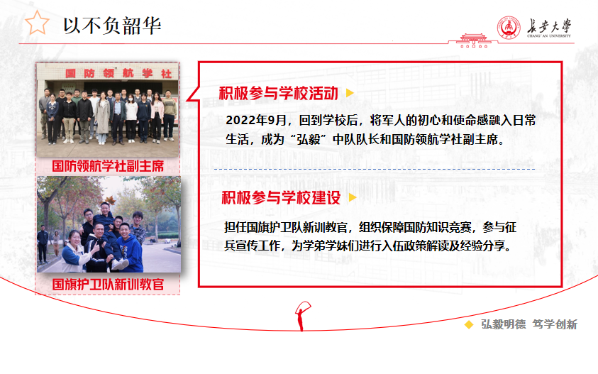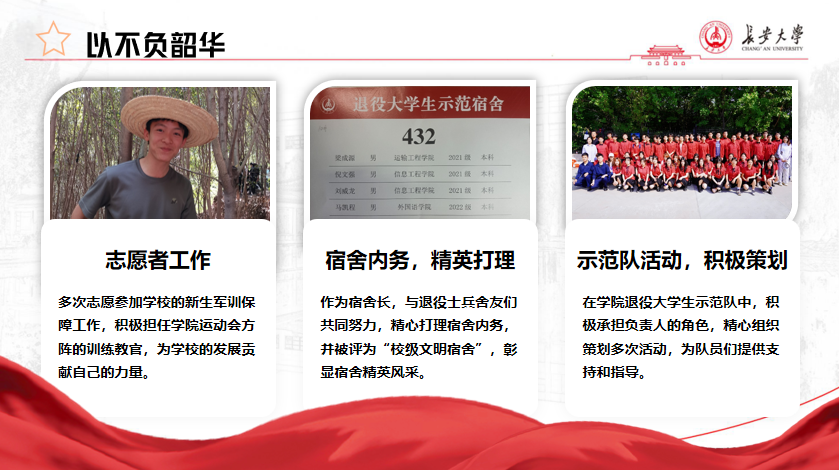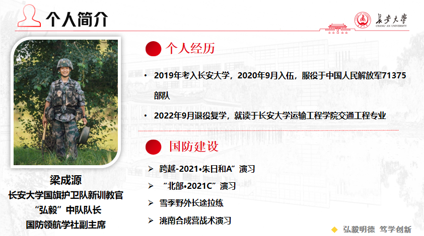 梁成源,男,壮族,新葡京线上娱乐 交通工程专业2021级本科生。2020年参军入伍,服役于中国人民解放军71375部队。在部队担任工程兵爆破手、装甲车车长、新闻报道员等身份,五次参与爆破作业,并负责连队生活及训练的记录报道工作,因表现良好,被选派往集团军军官集训队新闻报道小组,在战区宣传平台上参与写作发表三篇新闻报道。两年坚守在祖国北疆,保家卫国,坚守使命。服役期间梁成源参加“跨越-2021·朱日和A”演习、“北部·2021C”演习、雪季野外长途拉练、洮南合成营战术演习等大型军事任务,荣获“四有”优秀士兵荣誉1次、旅级嘉奖1次。2022年退役复学后担任长安大学国旗护卫队新训教官、“弘毅”中队队长、国防领航学社副主席等职务。
