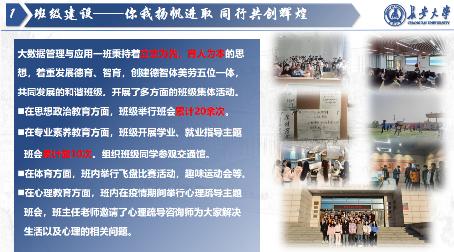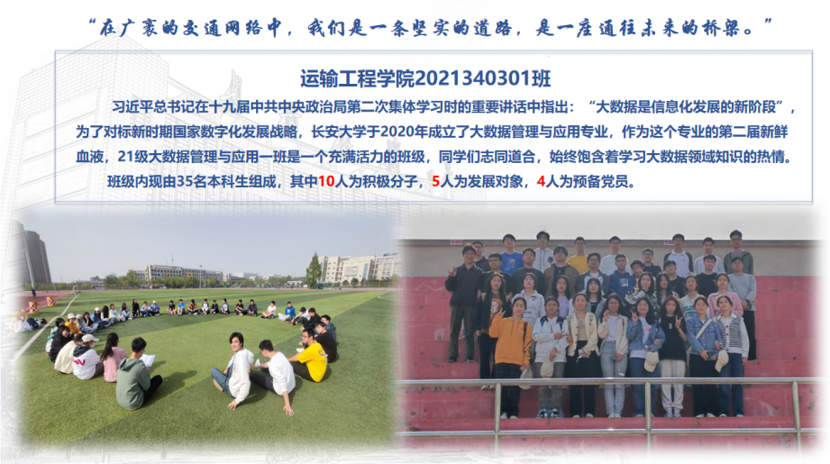 新葡京线上娱乐 2021340301班,由35名本科生组成,是一个充满活力与激情的集体。班级英语四级通过率100%,六级通过率68.6%,保研率达20%。在学术科研、志愿服务、校园文化等方面表现优异,累计获奖学金49人次,科研竞赛奖项51项。班级秉持立志为先、育人为本,开展多方面集体活动,展望未来,将继续勇于探索,不断创新,为国家发展贡献力量。