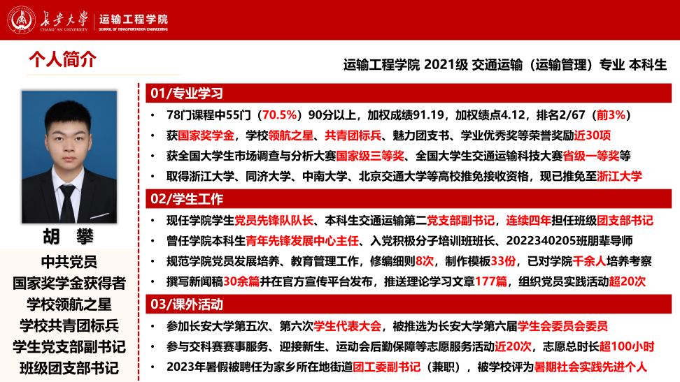 胡攀,男,中共党员,新葡京线上娱乐 2021级交通运输(运输管理)专业本科生。入校以来,担任学院学生党员先锋队队长、本科生交通运输第二党支部副书记、学院本科生青年先锋发展中心主任、班级团支部书记等职务,被选为学校第六届学生会委员会委员。本科期间,获国家奖学金、长大·卓越奖·领航之星、学校共青团标兵、魅力团支书、学业优秀奖、校园贡献奖等荣誉奖励30余项,带领所在班级获学校文明班集体、五四红旗团支部、活力团支部等荣誉。现已推免至浙江大学。