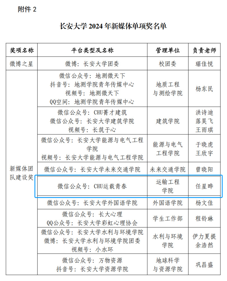 近日,长安大学党委发布《关于表彰2024年优秀校园新媒体平台的决定》(长大党宣〔2024〕143号),公布长安大学2024年“新媒体十佳奖”、“新媒体单项奖”等评选结果。新葡京线上娱乐 青年媒体中心(以下简称“运输青媒”)荣获“新媒体团队建设奖”,“优秀短视频平台创新奖”。