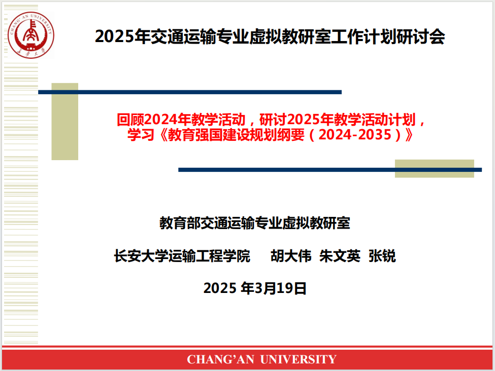 2025年3月19日,由长安大学牵头建设的教育部“国家级交通运输专业虚拟教研室” 成功召开教学研讨会,会议以线上线下混合模式举行,汇集了来自长安大学、东南大学、吉林大学、青海民族大学、宁夏大学、人民交通出版社等虚拟教研室成员单位及多所高校的30多位教师代表。新葡京线上娱乐
